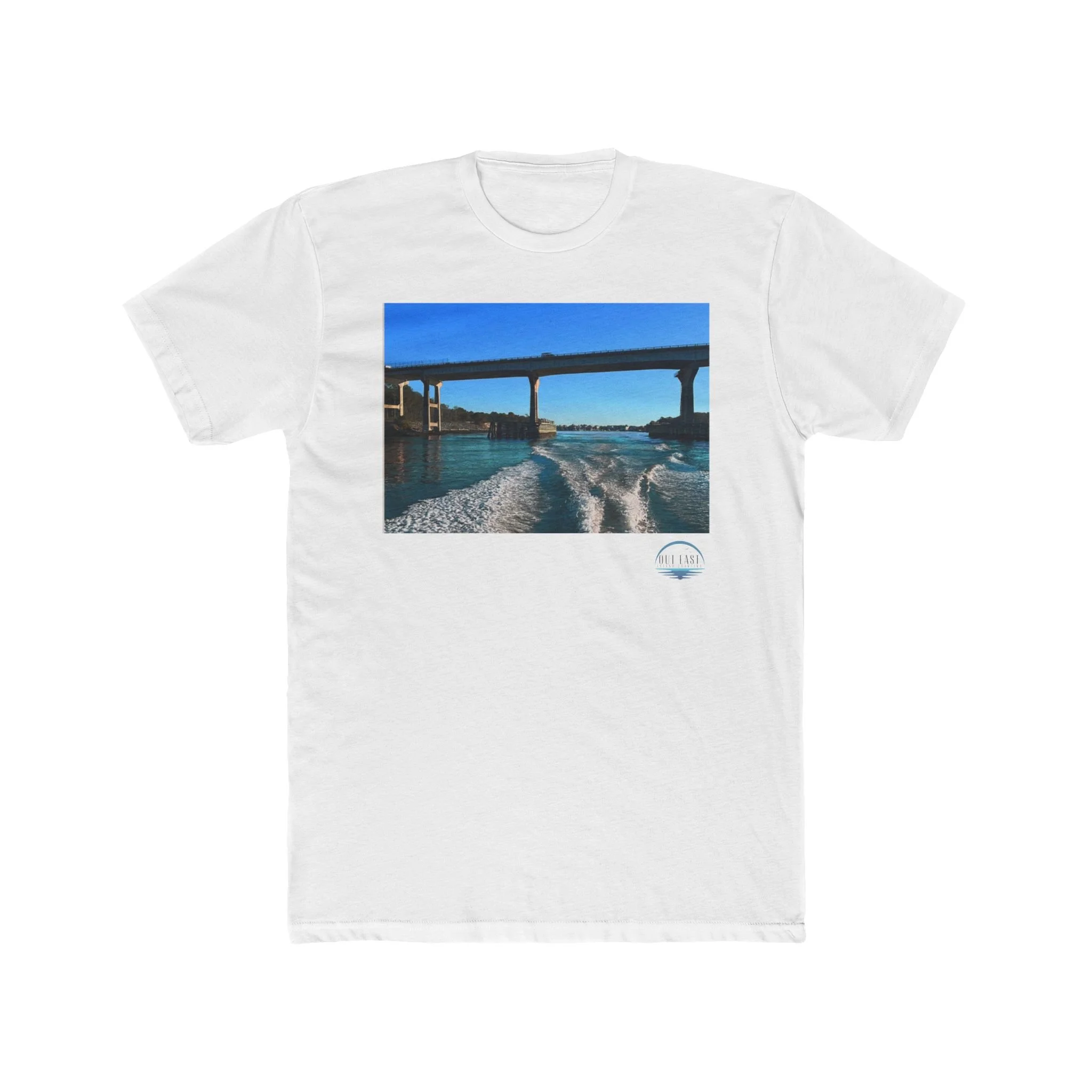 Welcome to "The Cut" white t shirt. A coastal-inspired t-shirt featuring the iconic Snow's Cut Bridge over the water. Designed to capture the laid-back boating lifestyle and scenic beauty of the Carolina coast.